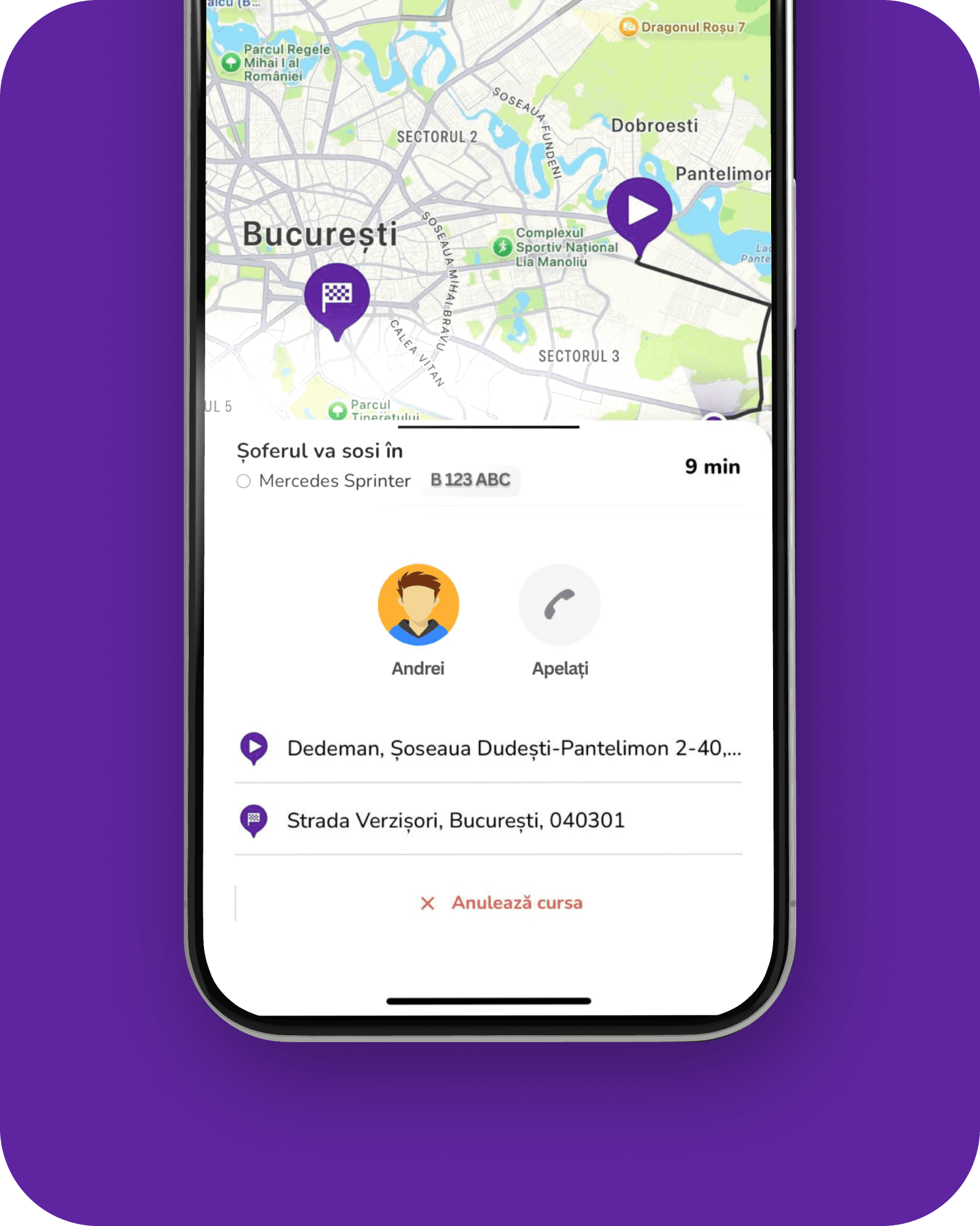 Poți vedea oricând, în timp real, unde se află șoferul tău sau îl poți suna.